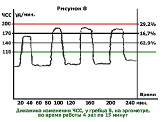 Рассмотрим еще тренировку на гребном эргометре«Гессинг»(рис.8) Гребец выполнял работу в количестве 4-х раз по 15 минут. В итпге спортсмен затратил